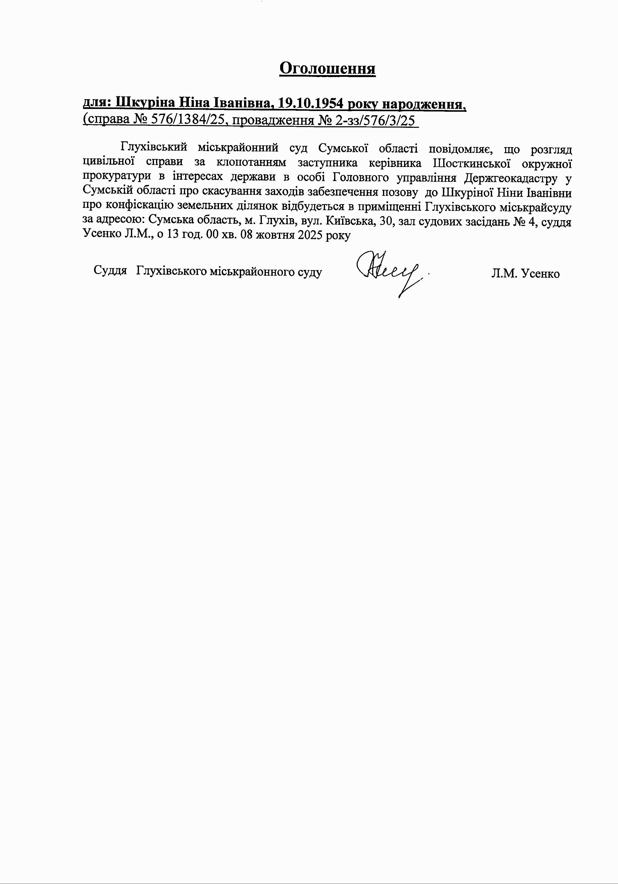 Оголошення щодо Шкуріної Н.І.
