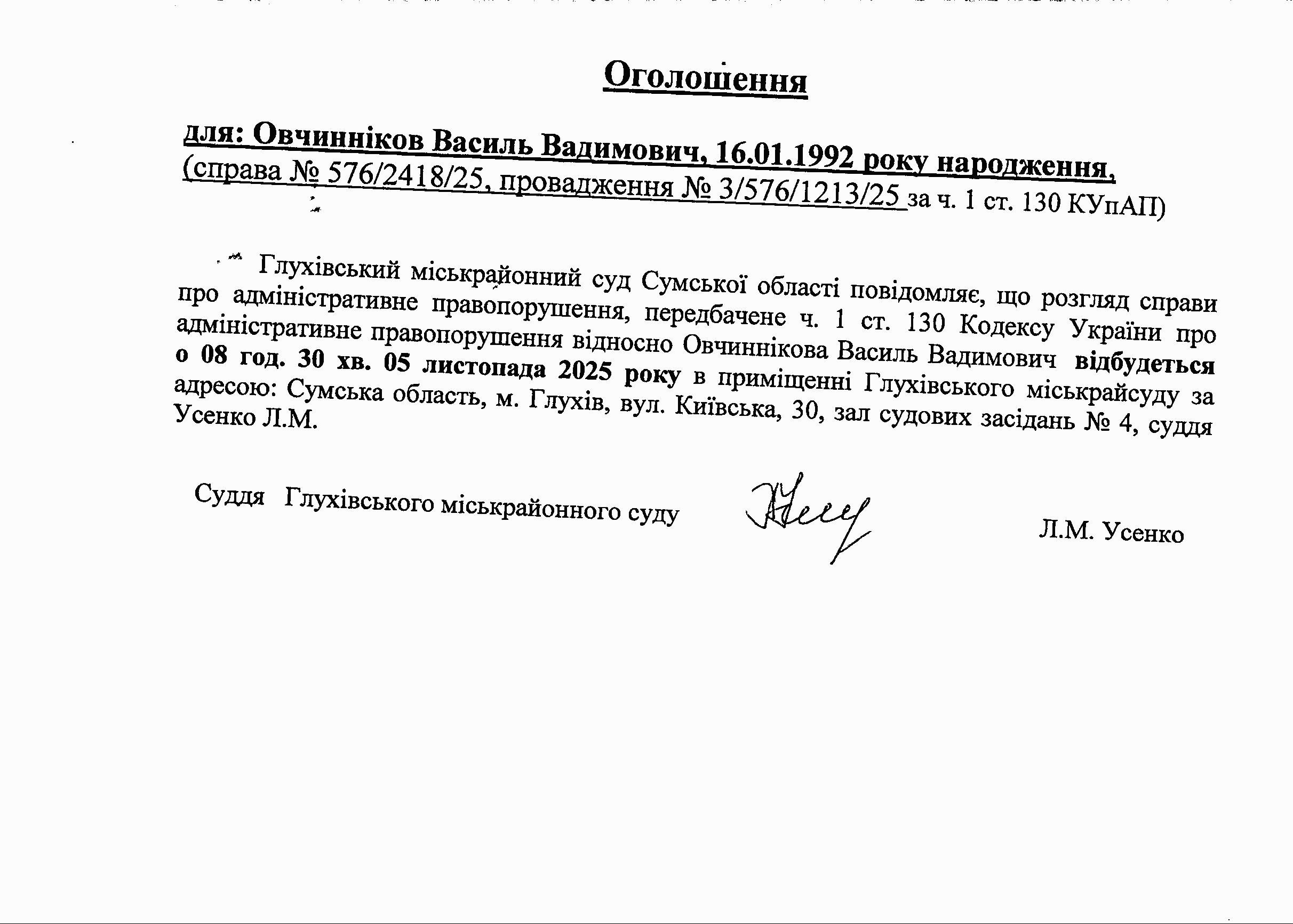 Оголошення щодо Овчиннікова В.В.