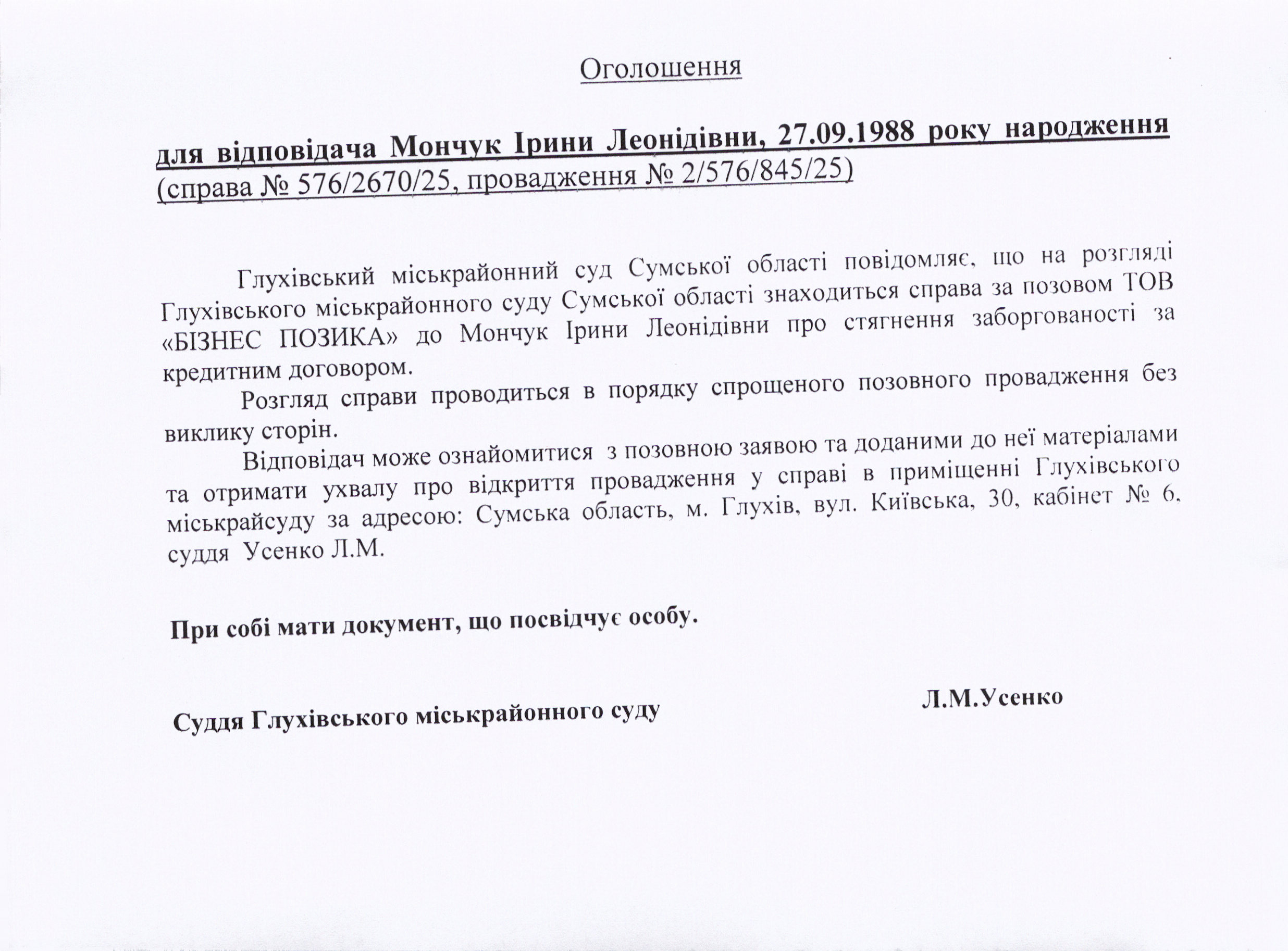Оголошення щодо Мончук І.Л.