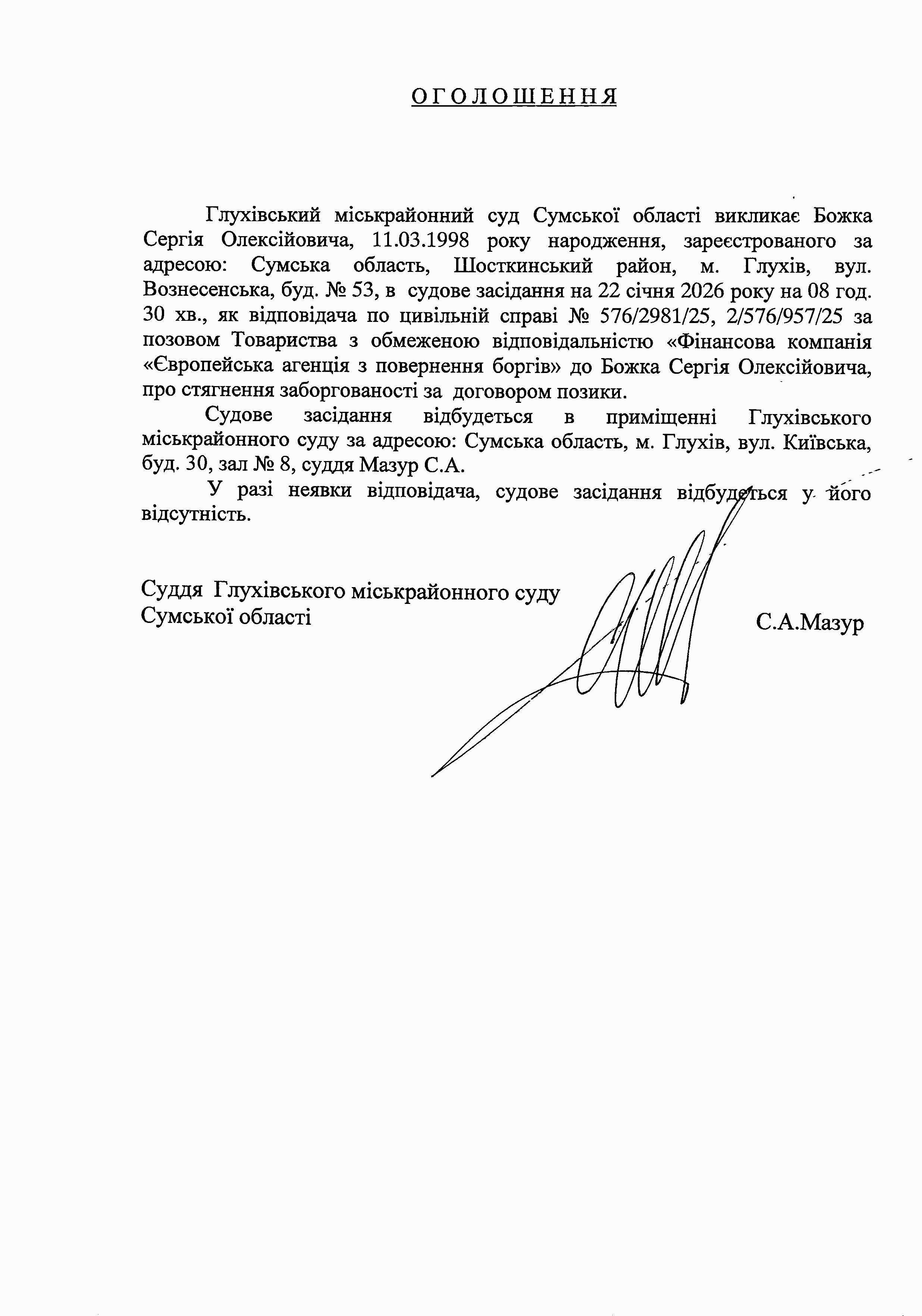 Оголошення щодо Божка С.О.
