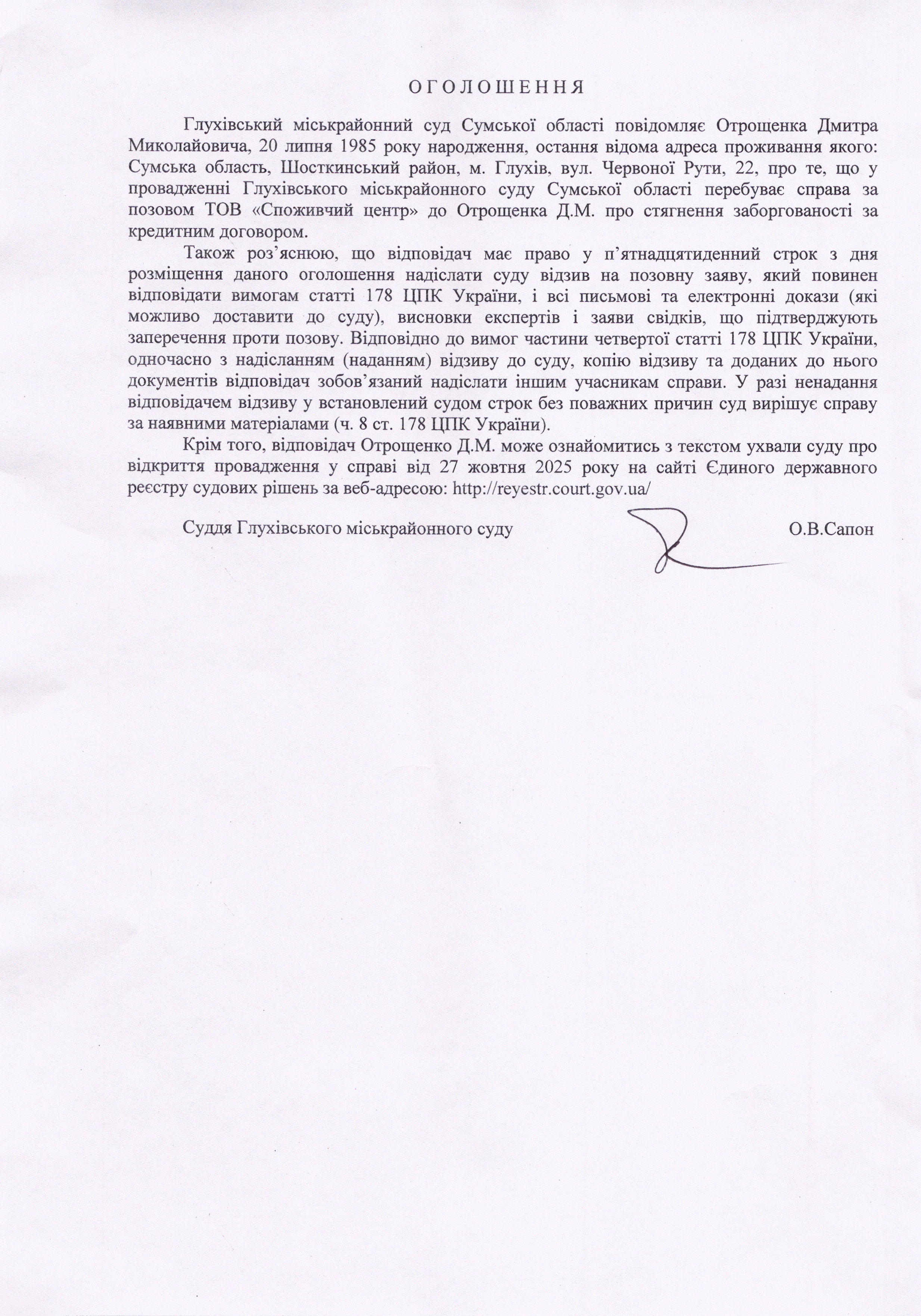 Оголошення щодо Отрощенка Д.М.