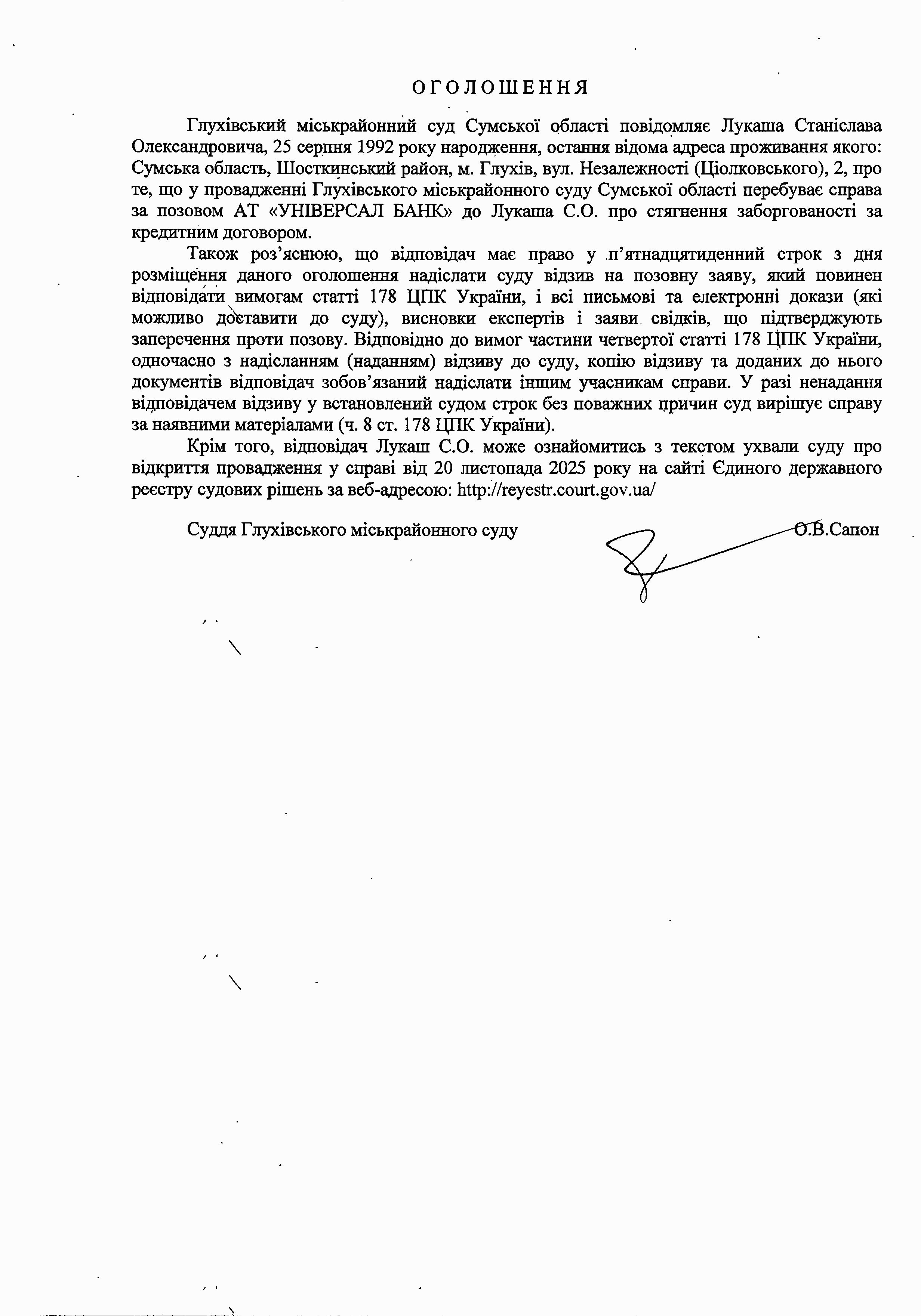 Оголошення щодо Лукаша С.О.