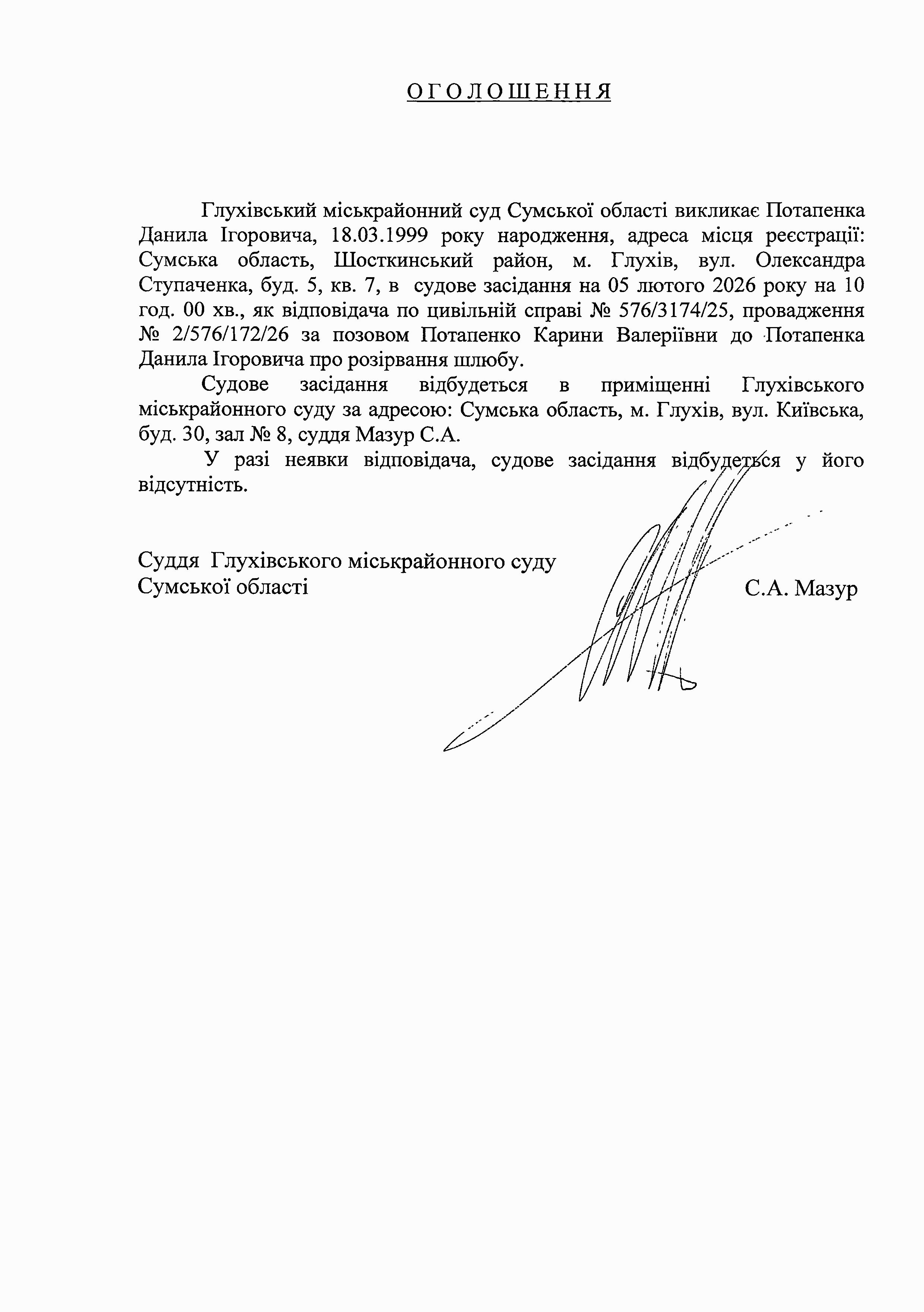 Оголошення щодо Потапенка Д.І.