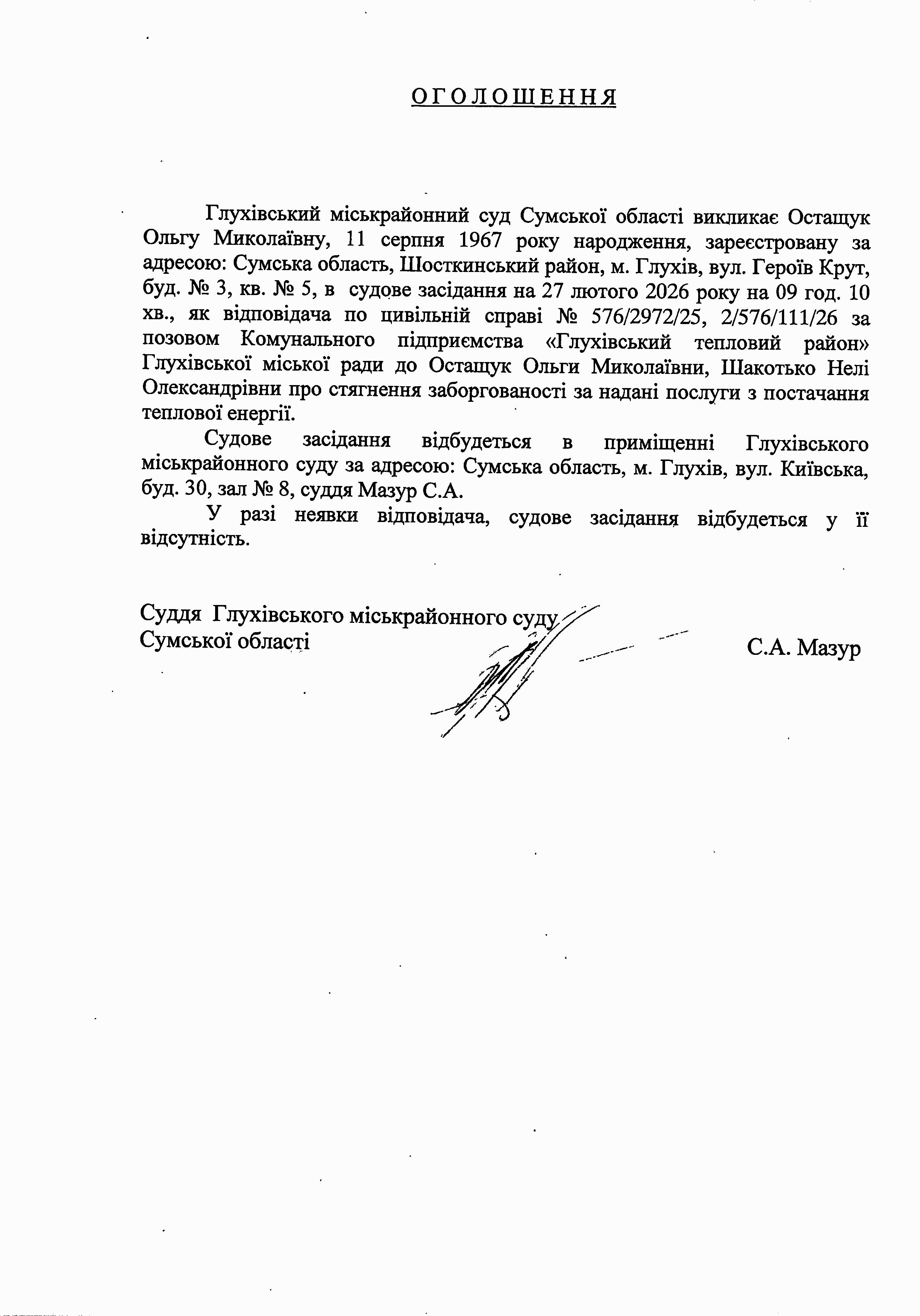Оголошення щодо Остащук О.М.