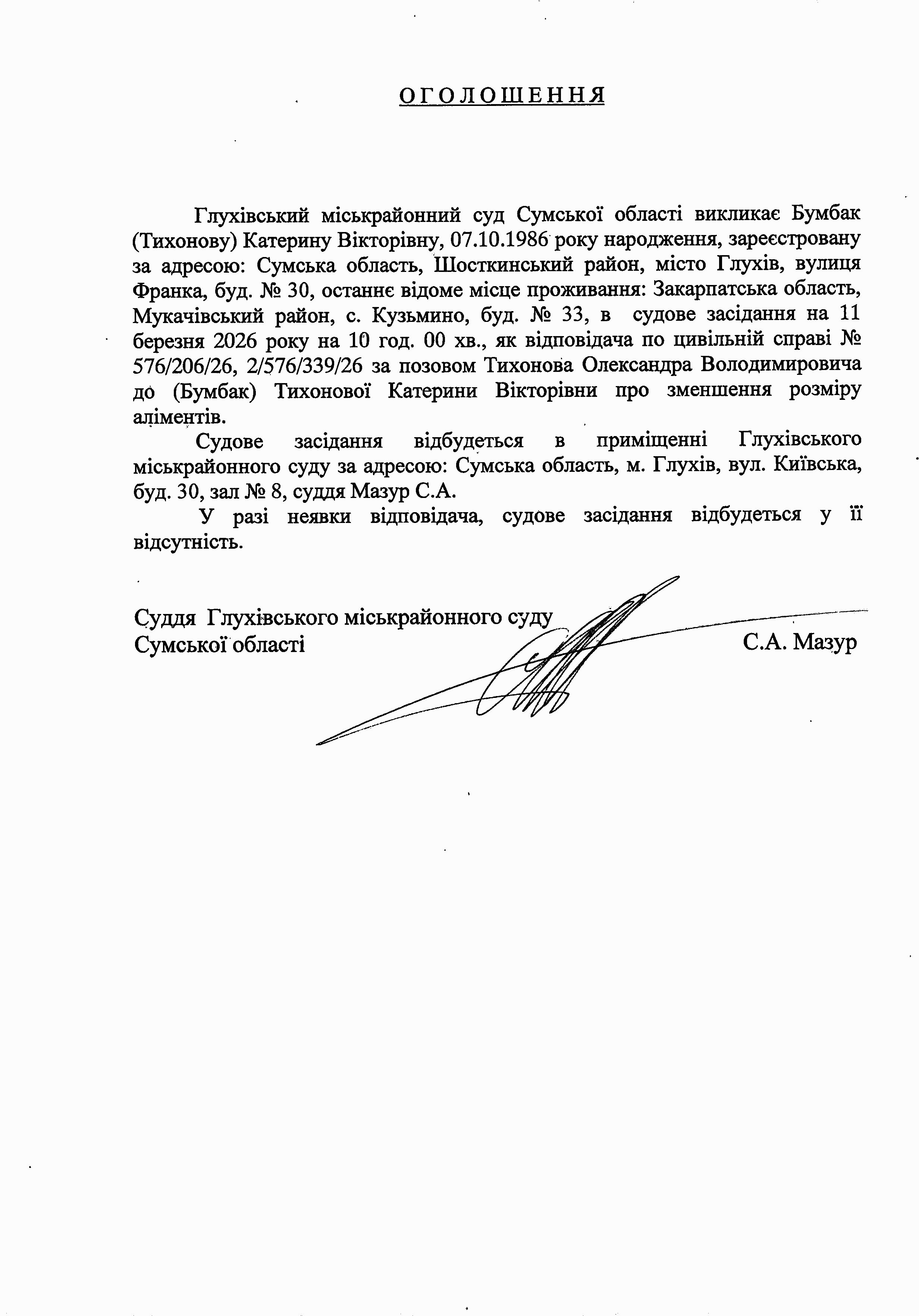 Оголошення щодо Бумбак(Тихонової) К.В.