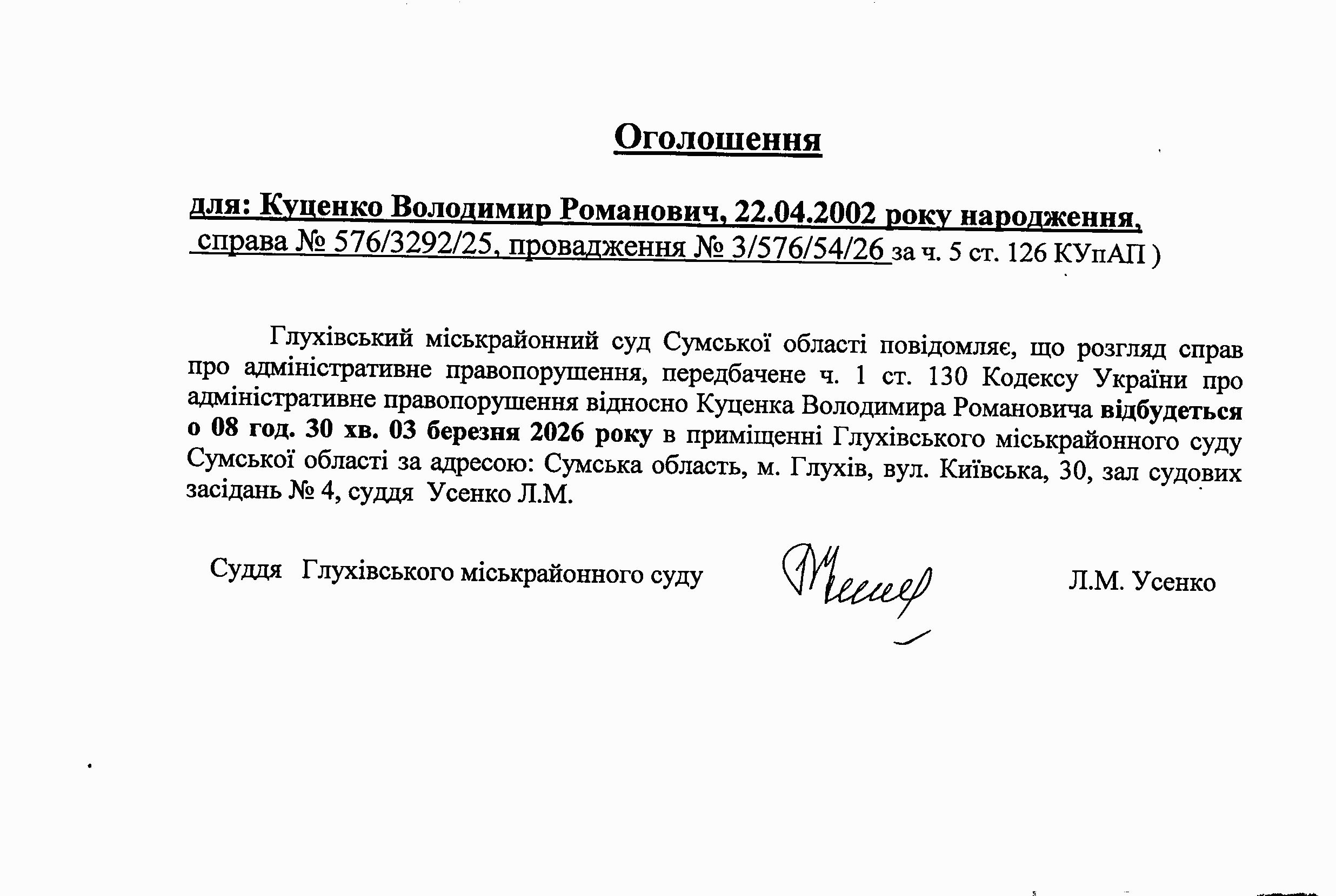 Оголошення щодо Куценка В.Р.