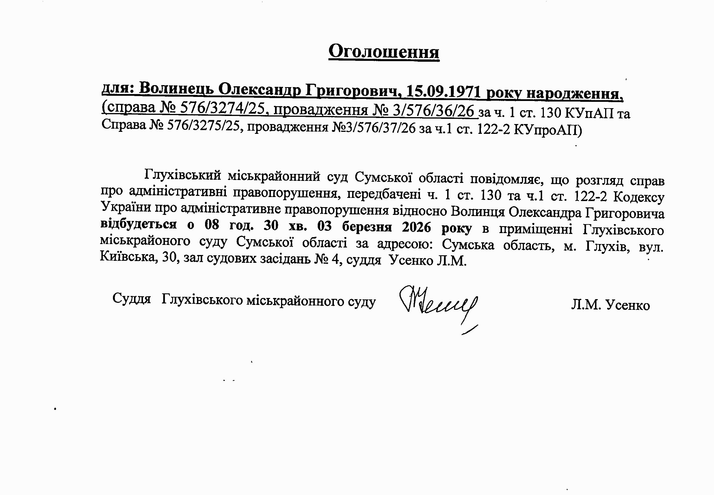 Оголошення щодо Волинця О.Г.