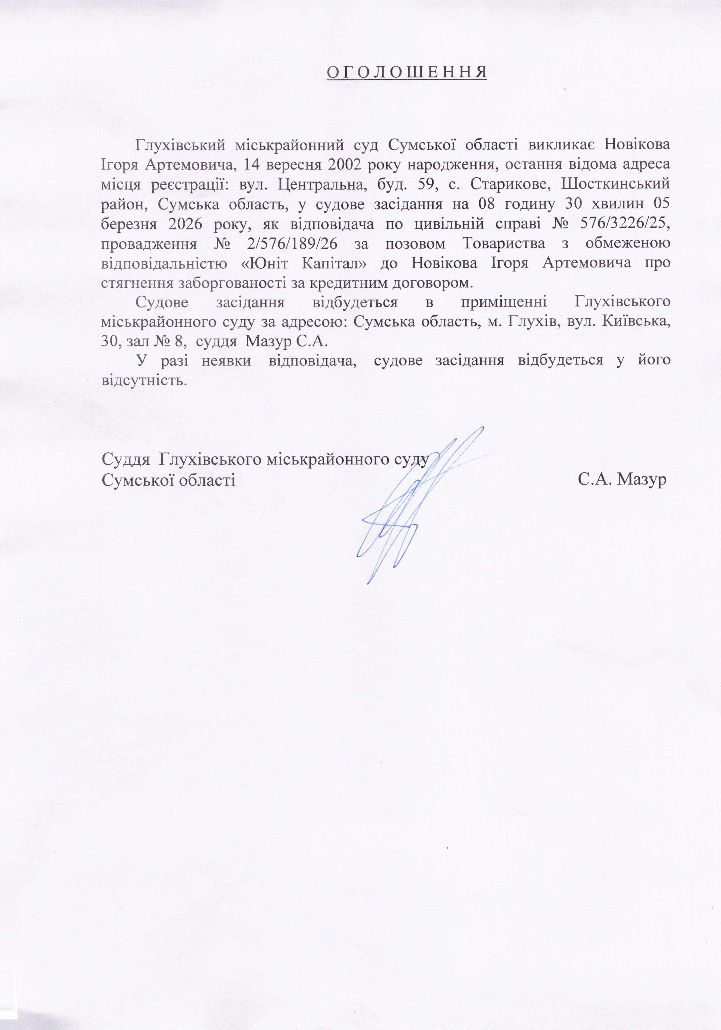 Оголошення щодо Новікова І.А.