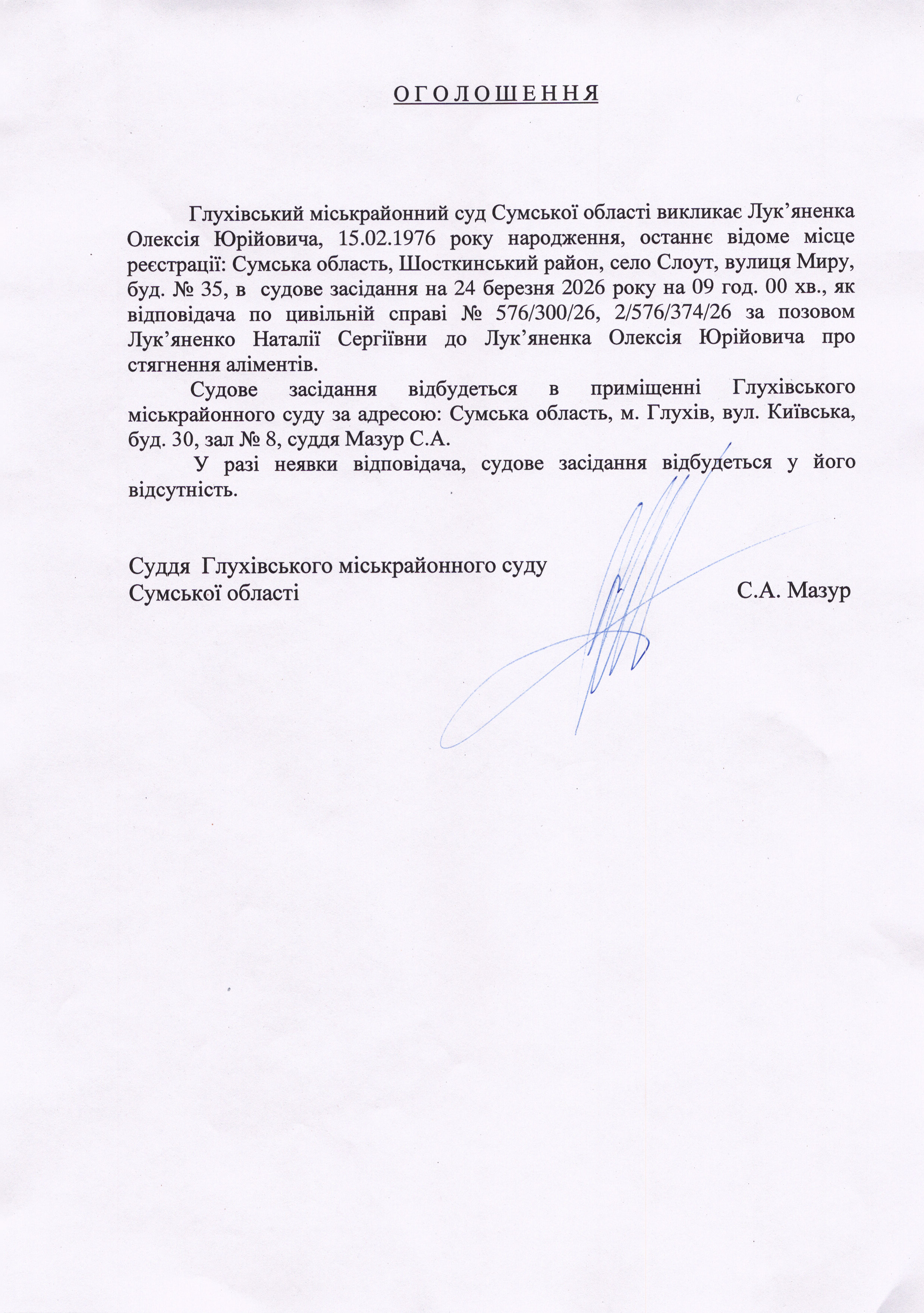 Оголошення щодо Лук'яненка О.Ю.