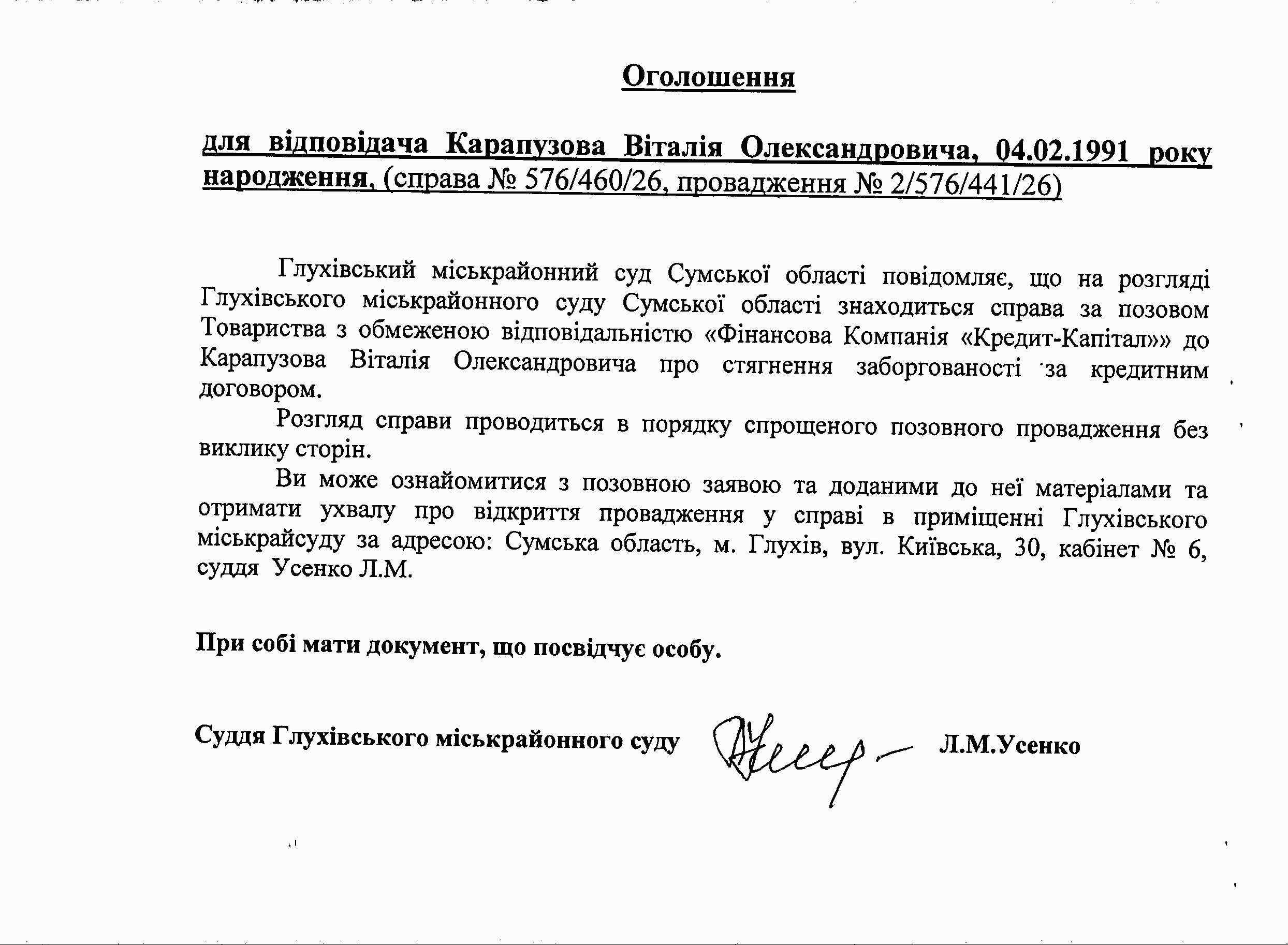 Оголошення щодо Карапузова В.О.